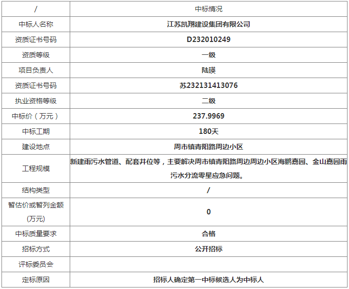 金山嘉园等写字楼小区项目名称:周市镇金山嘉园等写字楼小区雨污混流改造工程建设中标人名称:江苏凯翔建设集团有限公司中标价(万元):237.9969中标工期:180天工程建设规模:新建雨污水管道、配套井位等,主要解决周市镇青阳路周边周边写字楼小区