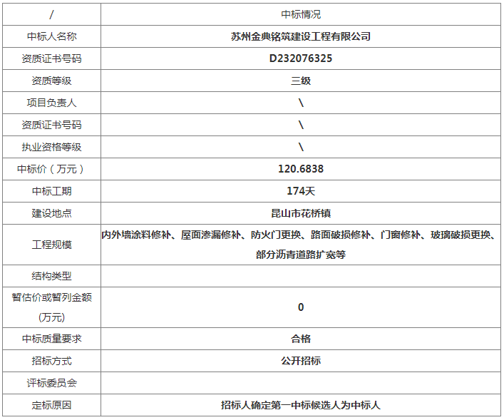 苏州金典铭筑建设工程建设有限公司中标价(万元):120.6838中标工期:174天工程建设规模:内外墙涂料修补、屋面渗漏修补、防火门更换、路面破损修补、门窗修补、玻璃破损更换、部分沥青道路扩宽等