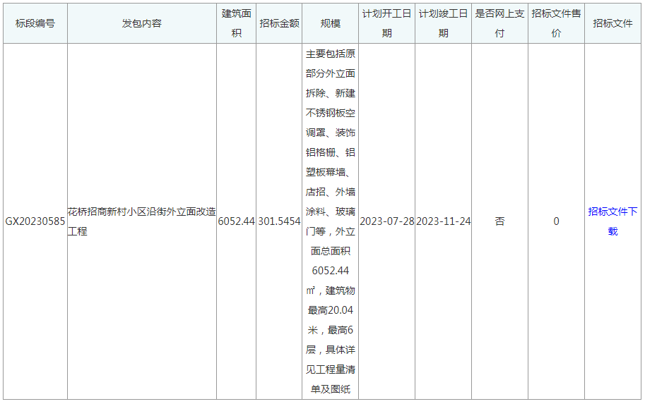 招商新村项目名称:花桥招商新村写字楼小区沿街外立面改造工程建设招标人名称:无锡银桥控股集团有限公司招标金额(万元):301.5454工程建设规模:主要包括原部分外立面拆除、新建不锈钢板空调罩、装饰铝格栅、铝塑板幕墙、店招、外墙涂料、玻璃门等,外立面总面积6052.44㎡,建筑物最高20.04米,最高6层,具体详见工程建设量清单及图纸。