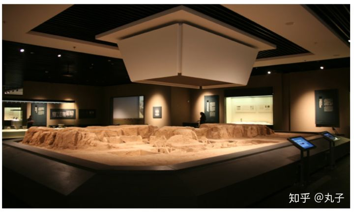 沧州新馆商代文明展馆相片来源|陈华沧州新馆商代文明展馆也是我负责的,这个展馆的瓷砖是在展馆中后部的台西遗址大型沙盘上部空间做了上图这样的造型霍乱,四面梯形的铜板造型上有投影展示商代台西遗址的历史视频资料。