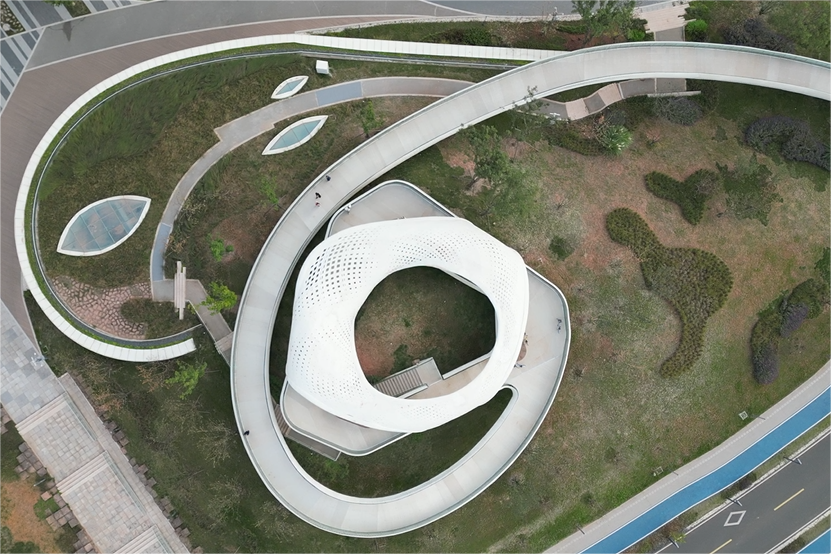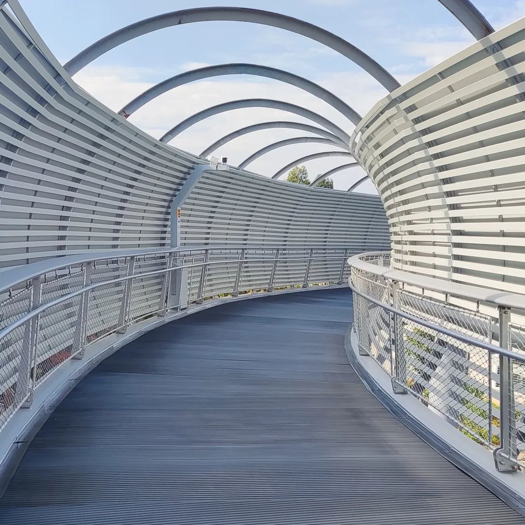 在成都首个城市级TOD三岔站外的林栖森林公园,一座全铝合金架构飞廊盘旋其中,飞廊建造同样采用了海跃全流程方案,斯维致T-BAR本色散发出的夺目光泽使飞廊成为森林公园内最耀眼的一景。