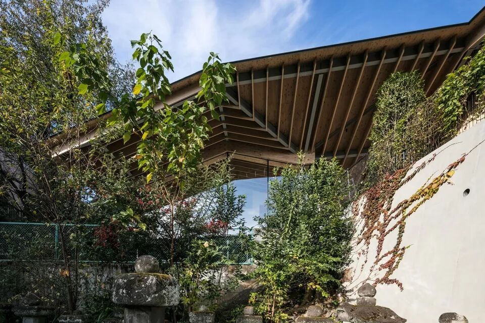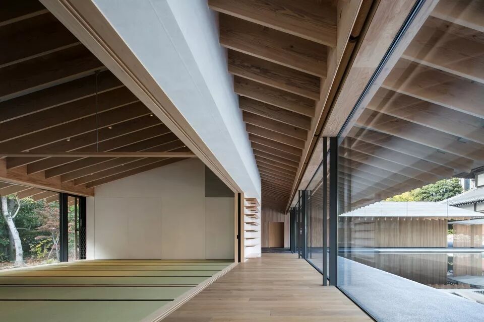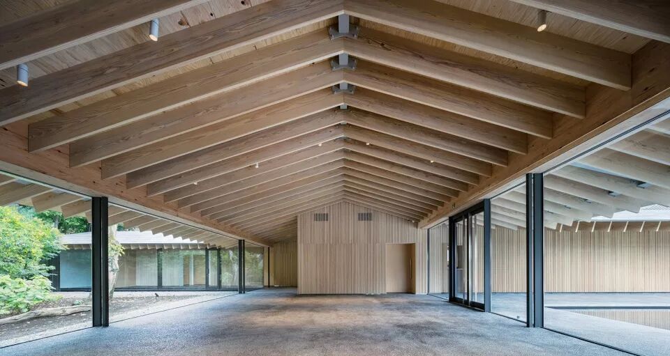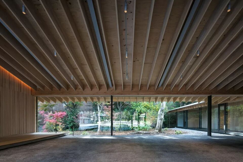 本项目的结构框架由钢和木材共同打造而成外部的木质托梁和百叶窗相互呼应,创造出一种几何图案,从而突出了Obaku Sect禅宗的特殊性▼室内空间局部,采用木材和钢制成的双坡屋顶,玻璃立面创造出一种通透感