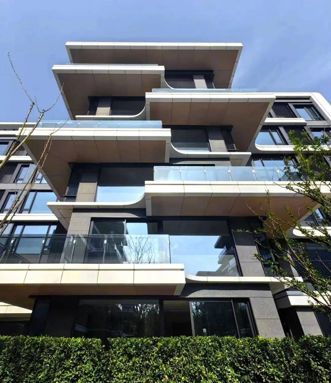 ▲麓悦青城实景图白色的立面象征武汉的薄雾漂浮;80%的金属铝板材质,配上玻璃栏板;铝单板、铝格栅、铝灰挡板、旭格门窗系统