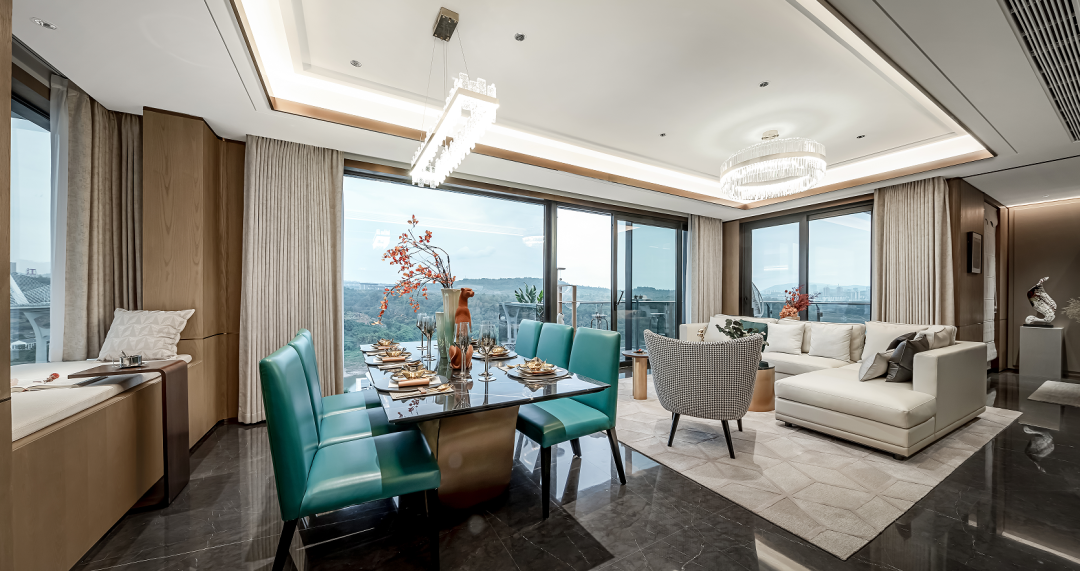 ▲麓悦青城 实景图运用新的结构设计维度表达固有的起居概念,不同于大众眼中的大自然风格,天地、山水在表演艺术手法的创新中消解本我,却在细节、线条的运用上感受生命体的绽放。