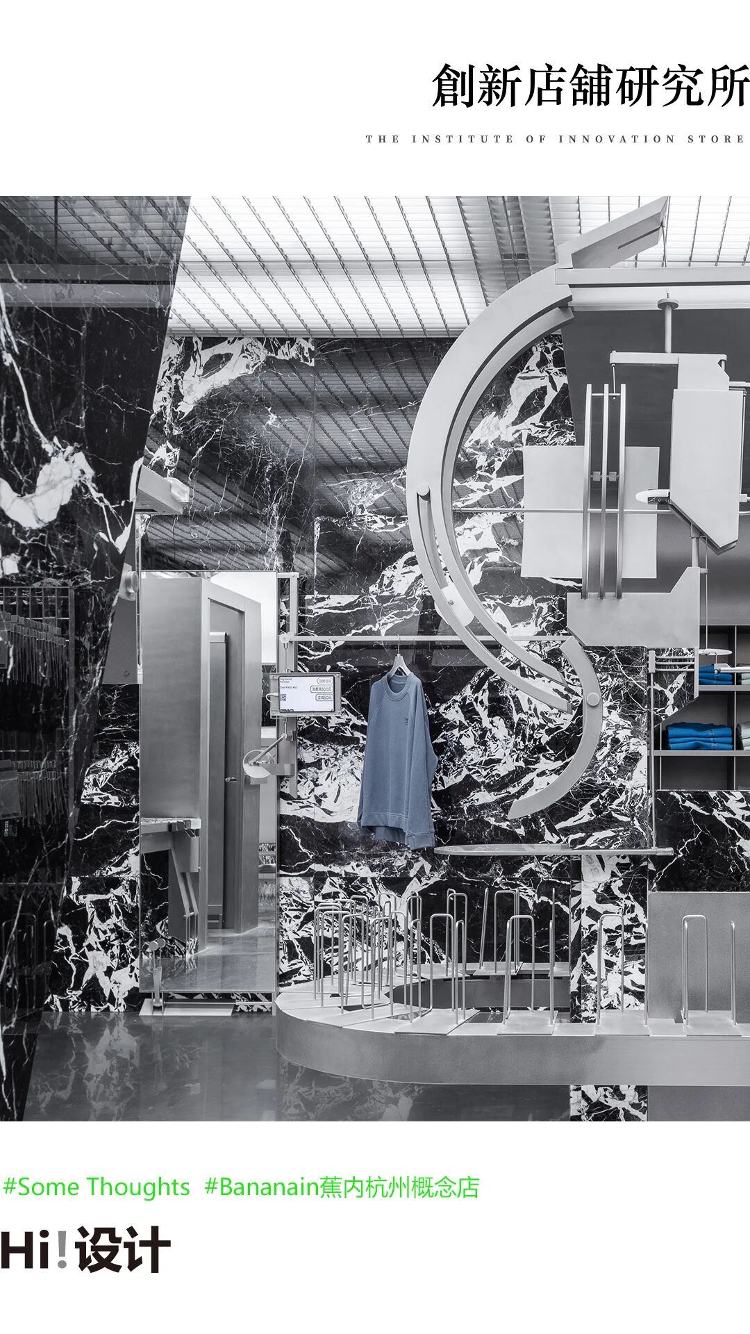 ▲试衣间、定制道具及其局部细节©SFAP当自然金属材料被破坏、打磨、重建,自然的残存帮助我们感知到有机的存在在Bananain蕉内苏州基本概念店的结构设计中,Some Thoughts以大理石与金属金属材料进行碰撞的方式激活着“自然”,并使得有机物在内部结构和解构间输出“过程的后现代”。