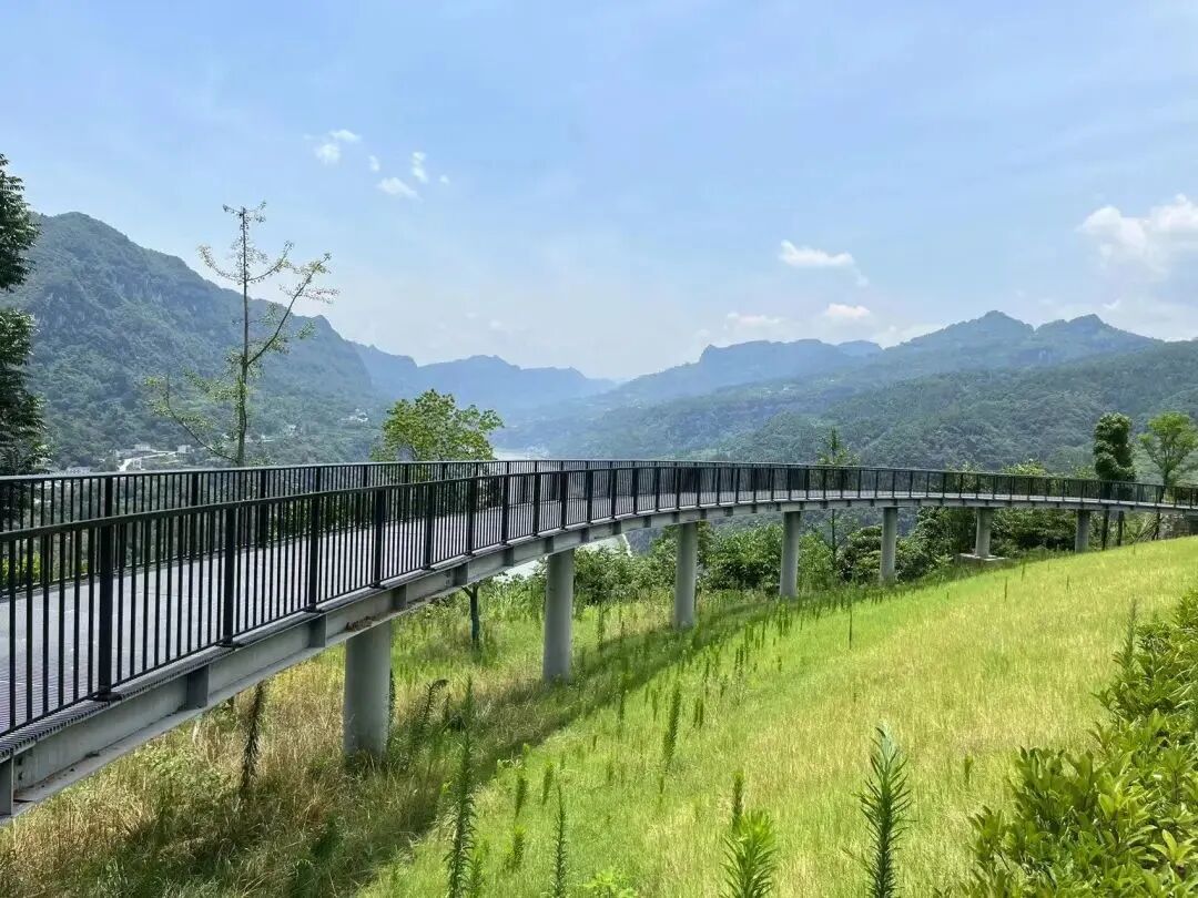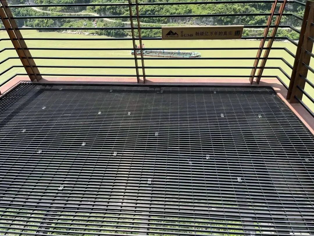 位于湖北宜昌G348国道旁的西陵峡观景台及小径桥,铺材全部采用亮黑色喷漆的斯维致I-Bar,中空扁铝的间歇仅有30mm,向下望去,险峻自然景观尽收眼底,给人以悬浮凌空的奇妙体验,斯维致工型铝前大灯的强大承载力保障了游客的冲撞安全,让人即使面对万丈悬崖也能泰然自若地行走站立。