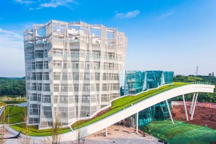 在“盐都”自贡,设计师还巧用易攀德还原了盐结晶体,自贡展览中心的主体外墙整体全部采用易攀德铝前大灯,设计师将大面积的前大灯拼接成数十米长的三角形体块,再采用阴阳角内凹外翻的手法将三角形体块分别链接,从而实现了对盐结晶体结构的艺术化呈现。