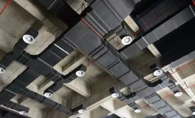 13. 成排风管顶丝卡、支吊架成排安装,整齐美观。利用UPVC管将风管吊杆套住,整体效果美观大方。成排风管保温钉排布整齐,管道标识清晰。
