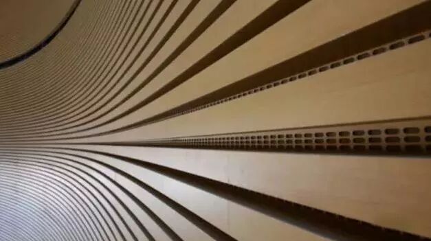 特征6:五个圆筒形舒适度纵横交贯,装饰材料规格尺寸繁多,观众厅丧尸横截面木饰面构造复杂五个圆筒形相贯线为扭曲舒适度曲线,铝格栅饰面有347种规格尺寸,总量为57168根;观众厅侧墙及包厢采用波浪式圆弧形木饰面,实木条有82种规格尺寸,总量为23480根。