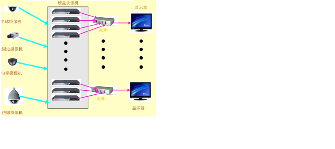 前端摄像机和报警器的信号直接接入到对应的监控主机上监控主机通过光纤接入到监控中心的网络交换机上,与数字矩阵组成模拟+数字的综合安防管理系统²前端设备前端设备主要是摄像机地下室、停车场、部分门诊通道及病区走廊等场所采用固定昼夜型枪式摄象机;电梯厅、护士站、门诊通道、住出院处和重要房间等固定场所采用昼夜半球型摄象机;大厅和地下车库等大范围监视区域采用室内彩转黑一体化球型摄象机;电梯采用专用摄象机;在每层的电梯厅和楼梯通道出入口处安装吸顶或壁挂式双鉴红外探测器。