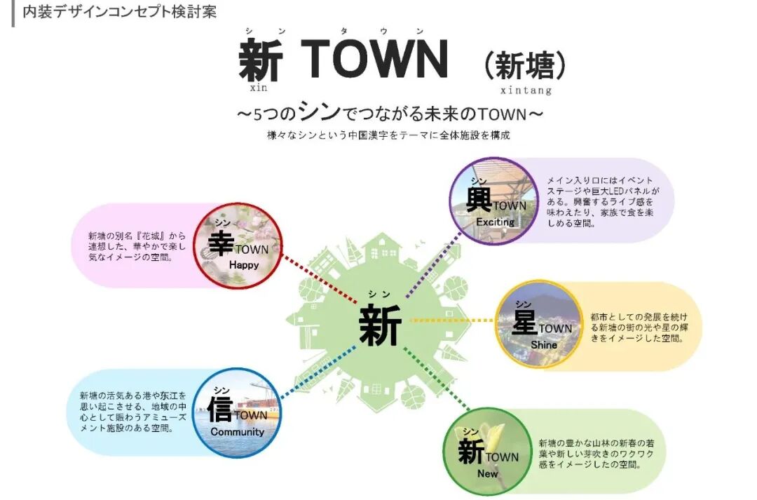 五个XIN“新(New),星(Shine),幸(Happy),兴(Exciting),信(Community)”,通过表现这五个关键词来展开内装结构设计。