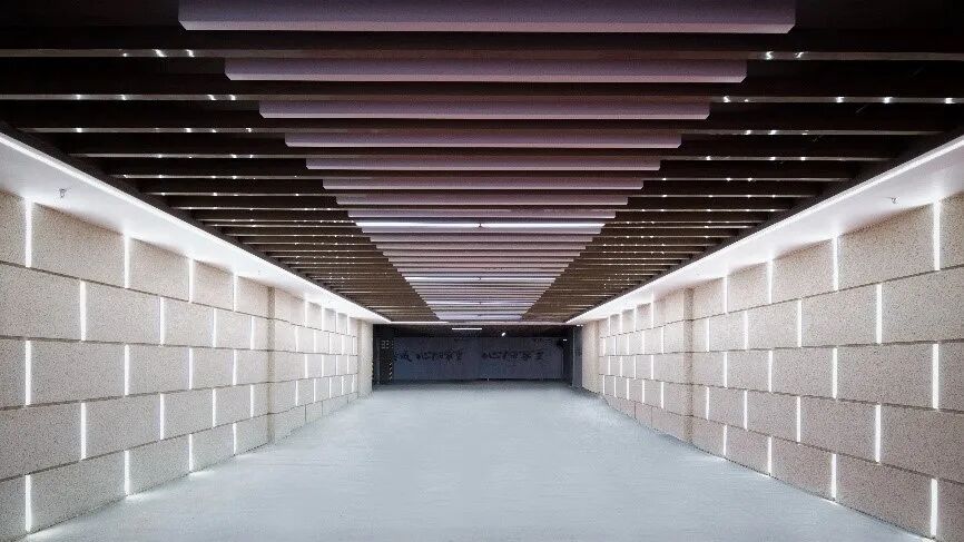 △ 地库出出口处车库出出口处顶部格栅长短错落,墙上镶嵌星光般的亚克力灯条,营造出归家的字符串感;整座地库的全环氧地坪漆的设置,辅以精心结构设计的颜色分区,给客户以更好的行车停车体验;车道吊顶采用铝格栅吊顶,遮挡管线,极大地提升了车库整体产品品质;车库大堂入户光厅打破传统简陋昏暗的地库入户方式,以穿孔铝板做出的星空式的照明系统,明亮、视线敞阔的光厅使整体生活氛围更显雍容大气,同时将室内铺贴延伸至车库大堂外,将产品品质生活的体验的精致感延伸。