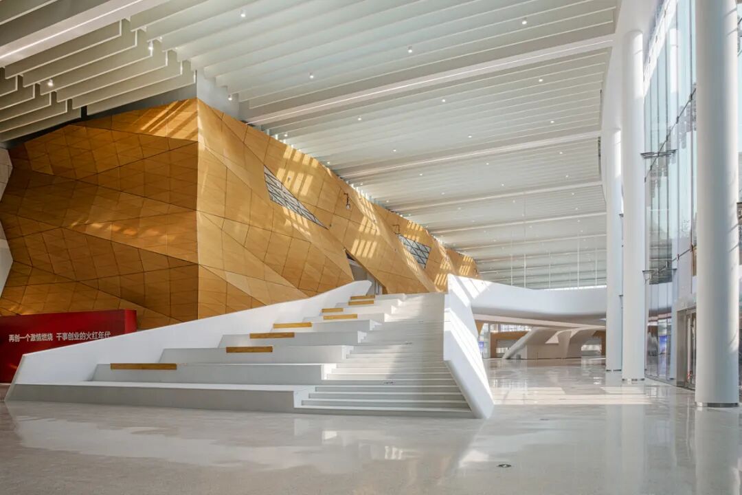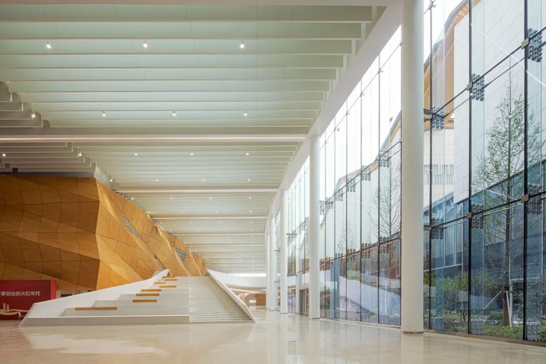 走近人民广场内,首先被此刻来袭的雄浑气魄所震撼人心,间歇性全外墙,紫色的铝挂板霍乱顶,阶梯式斜坡回廊,让回廊看上去透亮光亮,气魄极富!