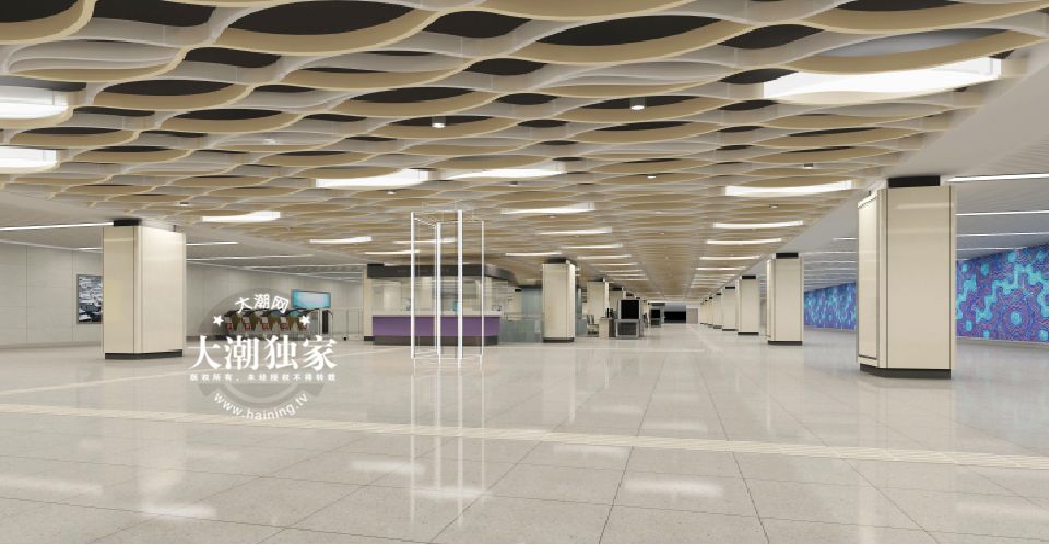△上北下南 打红圈处为地铁站出入口而海昌路站的地底空间设计是这样的:站厅层▼设计概念说明:格栅疏密变化,配合线型灯光,抽象表现吴兴特色的交叉潮,赋予空间变化和层次感,别具特色。