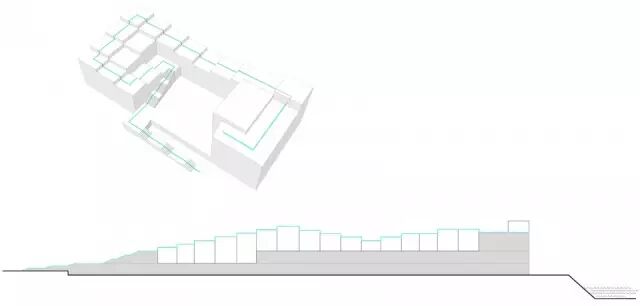 回廊被抬高至高架道路上方1.6米,是半地上层的外墙三个下陷花园为半地上层增添强光线和空气流通,为种植树提供更多土壤半地上层到了北侧和西侧与室外地面相平,可以直接出入,里面可容了南部的暗内部空间,三个回廊之间的服务区,以及西侧的几个居住表演音乐家梦工厂。