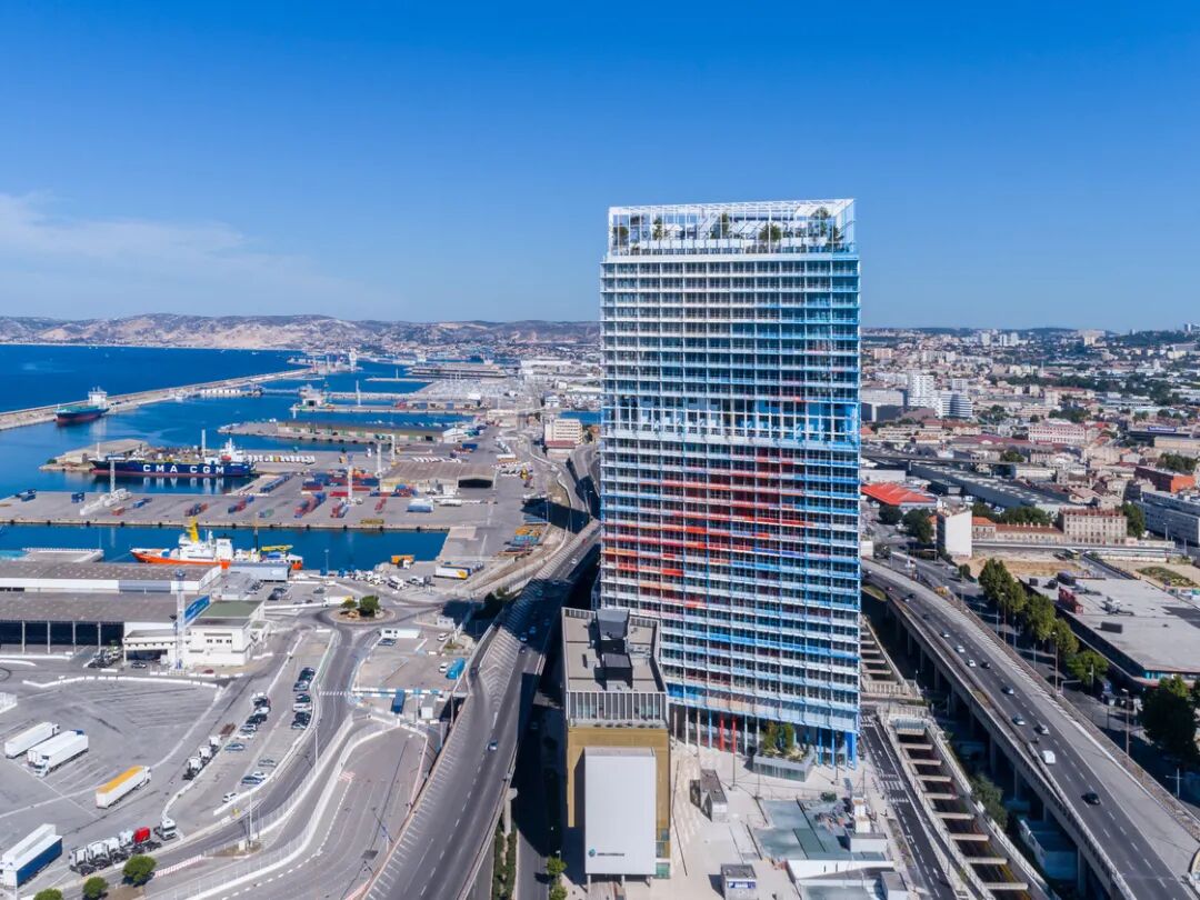 让•努维尔设计的马赛塔大楼——La Marseillaise坐落在Arenc码头,与扎哈•哈迪德设计的达飞轮船总部大楼相互对望。建筑物高31层135米,面朝大海,直冲云霄。