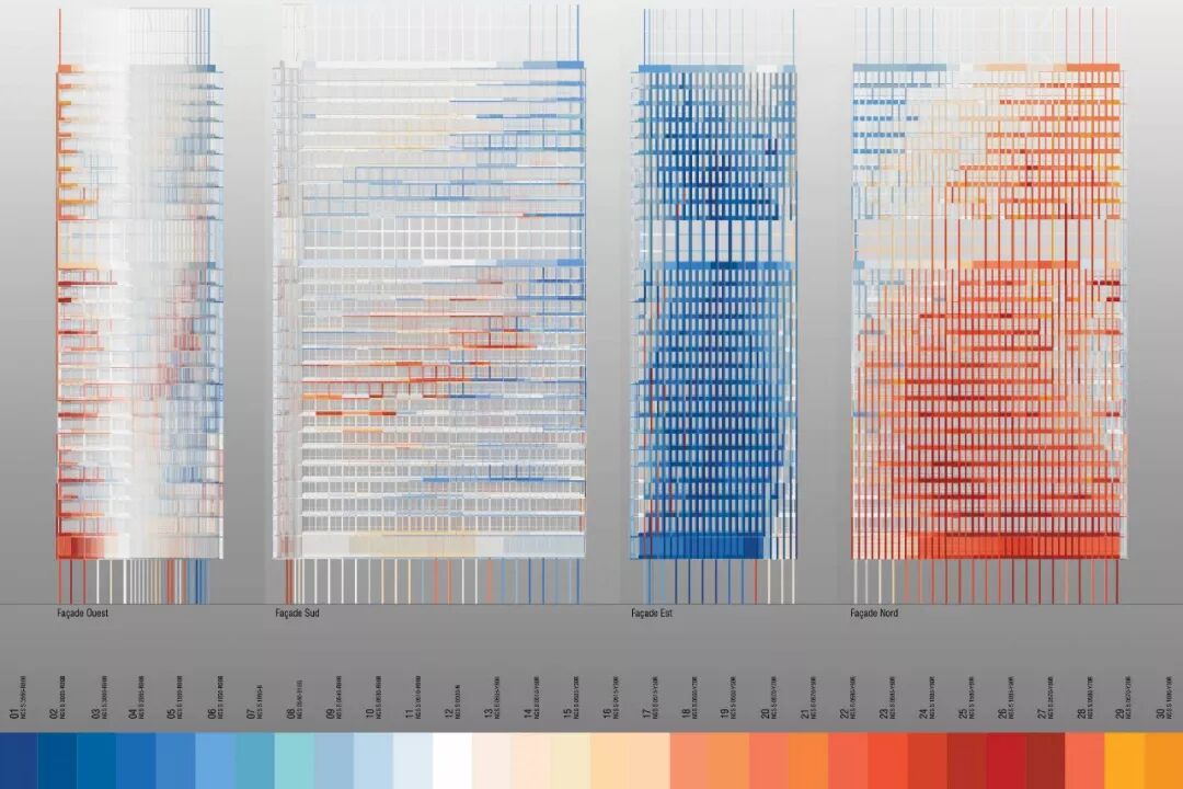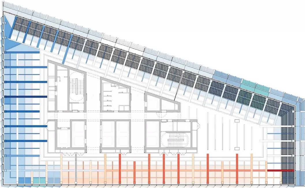从这张平面图可以清晰地看出每个颜色在建筑物的不同面向的排布每道颜色的排布都经过建筑物师精心部署,使得建筑物的外观格外引人注目。