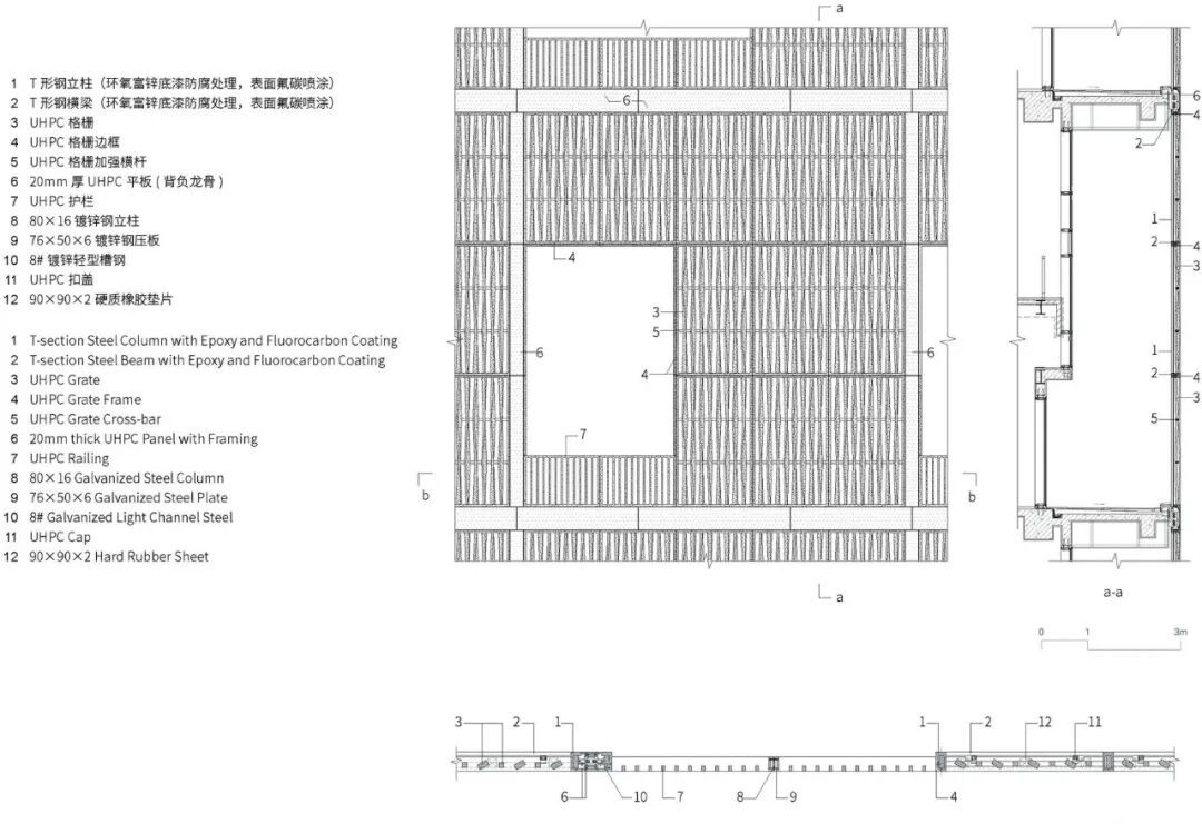 金港下城A区南门廊前大灯详图 ©URBANUSUHPC玻璃幕墙体系的水平龙骨与竖向主龙骨利用连接件通过螺丝连接,UHPC玻璃幕墙及T管状内部结构龙骨体系的自重吊挂在上部层楼钢筋内部结构上整个工程项目工程施工业务流程依次为钢连接件与竖向龙骨连接、T管状竖向龙骨吊装安装、T管状横向龙骨安装、横梁上安装铝角码、测量调整铝角码位置、UHPC前大灯面板吊装安装、调整就位后固定、修复安装孔、清洁验收。