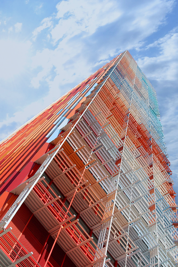 颜色是在外墙面和构架上的立体涂装,不是简单的在一个平面喷涂,30种颜色的彩色钢筋装饰着法国马赛的天际线。