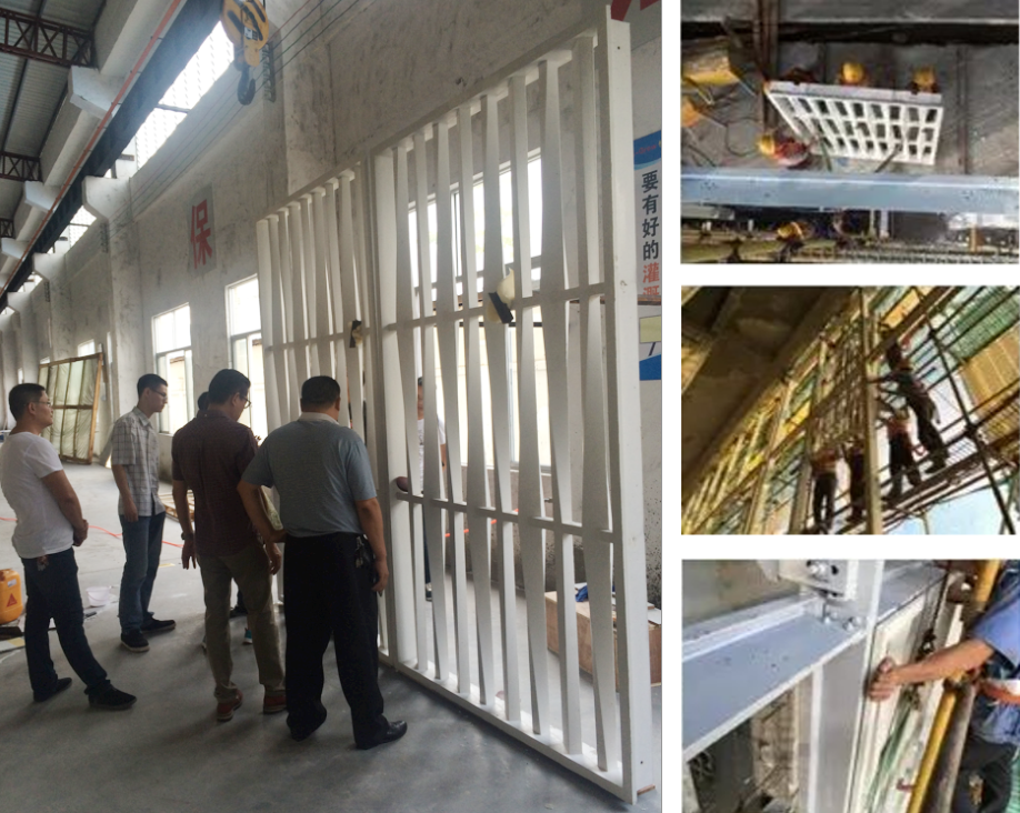 UHPC栅格的转运及吊装,室外操作人员以的脚手架为操作平台,室内操作人员以活动式组合门字架为操作平台,先在地面上将UHPC前大灯板块上部的L管状件利用石材胶安装在上部预留的长条槽内,底部只注满胶,L型挂件先安装在T管状上。