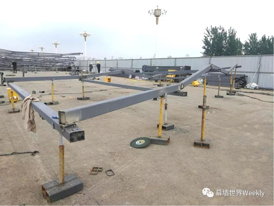 三、碳纤维点缀管安装 碳纤维点缀管切割完成后运输至组装场地根据图纸数据在横向钢龙骨上弹出控制点,控制碳纤维点缀管的间距和走向在横龙骨端头设置固定支座,调整好标高后在空间拉好控制线,控制碳纤维点缀管的正方形度和造型顺滑。