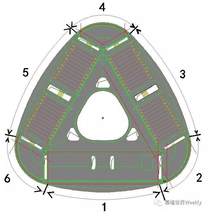 △ 沿檐口造型处划分网片,单元式整体吊装 单块网扇宽度4~6米,高度在9~27米,板块占地面积约在36㎡—150㎡间,大量板块在50㎡左右,最小板块重量约3吨。