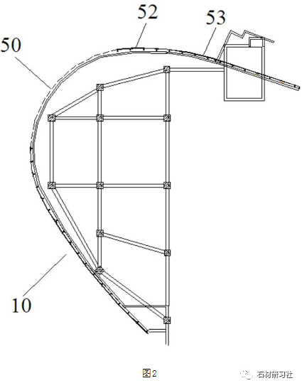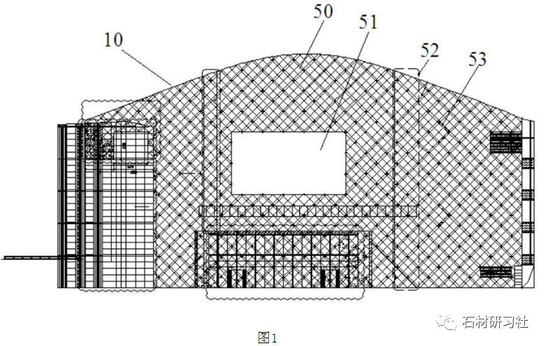 两个梯形玻璃幕墙26间加装有碳纤维点缀轮廓40,碳纤维点缀轮廓40透过螺丝一般来说 于钢制架构20上,其内加装有LED灯具41整个梯形梯形石料玻璃幕墙中部为正面的梯形石料玻璃幕墙部分50,当中心加装有大型 LED显示屏51,梯形石料玻璃幕墙两侧为直板石料区域52,直板石料区域52避开正面的梯形石料 玻璃幕墙部分50的一端相连侧面的梯形石料玻璃幕墙53。