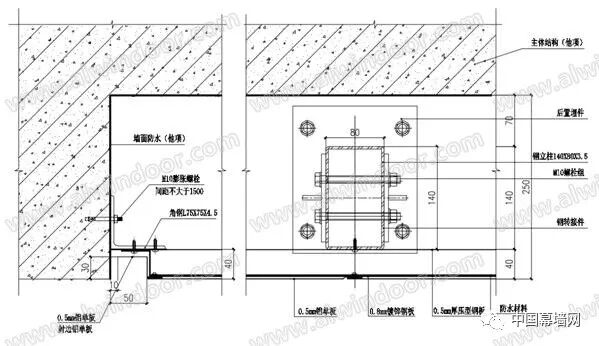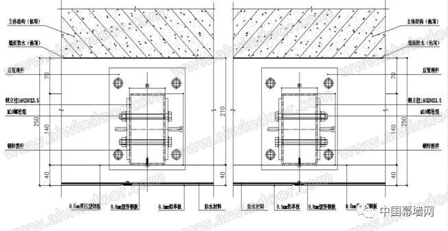 这不仅使龙骨很难满足建筑设计年限要求,而且锈蚀水还会造成幕墙龙骨和面材的污染(如图2.1.3-a)由于本工程铝板的横向分格与水平面呈30度夹角,而主体结构为水平布置如果在层间采用插芯对接或者其他使龙骨下端释放的连接方式,那么在层间的位置,就形成横龙骨跨越两个变形区的情况。