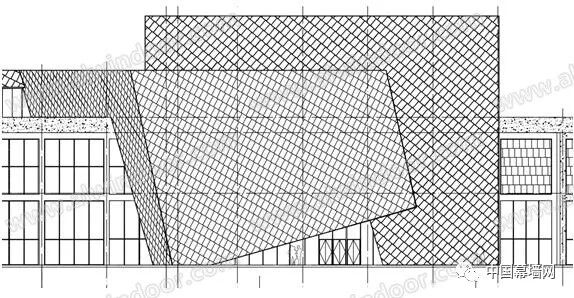 图4.1.2墙面方形平锁扣金属板的效果图 4.2新建建筑墙面上的菱形平锁扣金属板 菱形平锁扣金属板分布于建筑中部新建造型及屋顶火山口部分的立面与斜屋面,其立面的典型的形状见下图4.2: