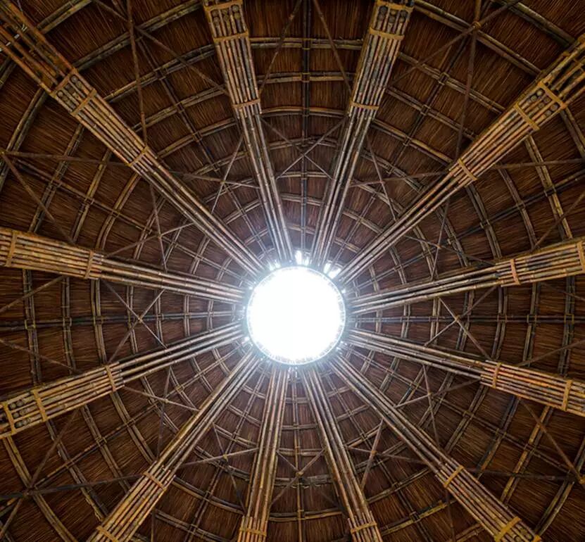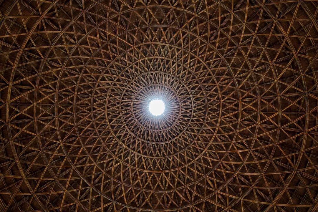 02 木圆顶 我们通过将连续的圆顶面网格化,也能用木头来清空那个圈。木头相比于碎石,抗拉和抗弯性能都更加优秀,并且材料本身也不会显得那么冰冷,能给人以亲近和温暖的感觉。