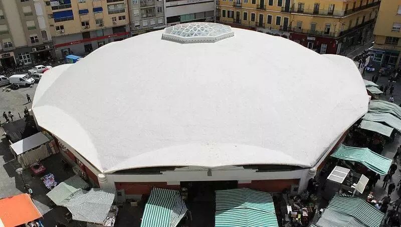 阿赫西拉斯镇集市阿赫西拉斯镇集市的壳体比较扁,服务中心角约32度,加之采用了预应力,壳体呈整体承压的状态当地雨水比较少,壳体表面没有做防水,裸露的钢筋表面依旧充满光泽,没有太多岁月侵蚀的痕迹时年34岁的托罗哈凭借这样一个小镇集市的设计,一举成名。