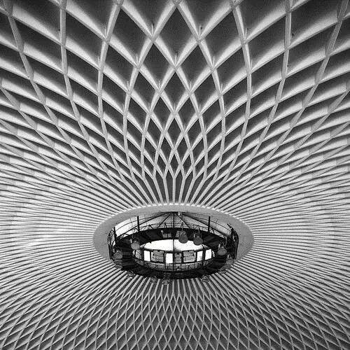 板间的钢筋钢筋肋和节点现浇,后在上面再整浇一层钢筋,形成整体并兼作防水层由于采用了奈尔维体系(Nervi system)”工法,建造成本大幅降低,而工期仅用了7个月时间预制的菱形板和现浇的肋线,形成优美的天花,堪称建筑物、内部结构、施工完美呈现的艺术品。