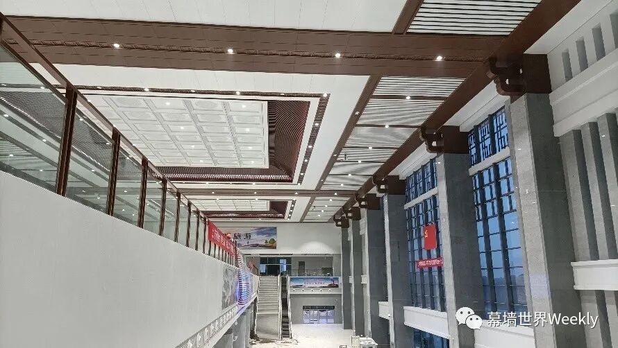四、20米超长不间断铝条板吊顶 为了呈现完美的装饰效果,庐江西站一层候车大厅吊顶采用了20米的通长铝条板,被国铁集团领导誉为“中国之最”。