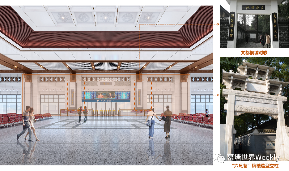 △ 二层检票口两侧,设有“文都桐城”对联,“想过去冠盖满京华,文章甲天下;看今朝人文重崛起,再度领风骚”,空间营造古韵新风,融古汇今,令桐城东站成为桐城文化传承的桥梁。