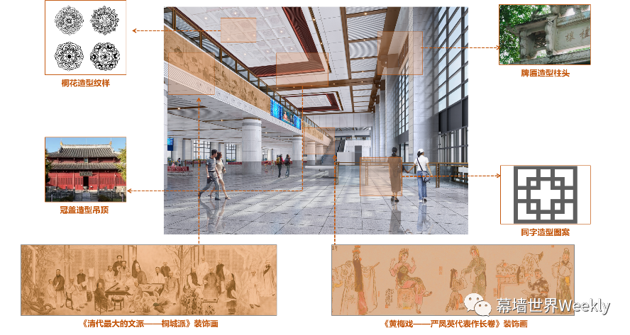 室内设计大量使用了冠盖造型、桐花造型、同字造型等元素,配有徽派特色及桐城文化的装饰画,可以说用心打造了一个具有历史文化意义的新时代高铁站房。