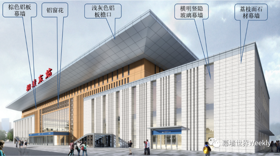 庐江西站建筑外墙以菱形窗为主要造型元素,大小变化的菱形窗孔如同镶嵌在墙面上的一颗颗矿石,呼应庐江矿业大县的地方特色。