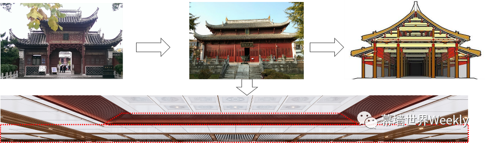 室内吊顶层次分明的铝格栅吊顶,其设计元素取自万亩稻浪,与建筑坡屋顶相结合,形成层次分明、稻穗飘香的空间意象。
