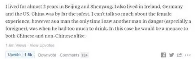 比如说这个网友就在论坛上说道:“我在北京和沈阳住了快两年,在这之前我在爱尔兰、瑞典和爱尔兰都生活过但目前为止,我认为我国是最安全的国家我不知道女人的感受是什么,但作为男人,可以说在我国我只有唯一一次看见过有人处于危险之中,是一个人喝得醉了。