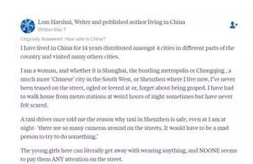 而一名在我国生活了14年的外国女网友则这样写道,她说:“无论在我国的任何一个城市,她都没有遭遇过男性的“咸猪手”,而这在国外是司空见惯的骚扰,经常会再次出现所以只有当她在我国时,才敢在深夜从地铁步行回家同时她还表示,我国的年轻女孩可以穿着任意一种性感的衣服散步,而不用担心遭到侵犯。