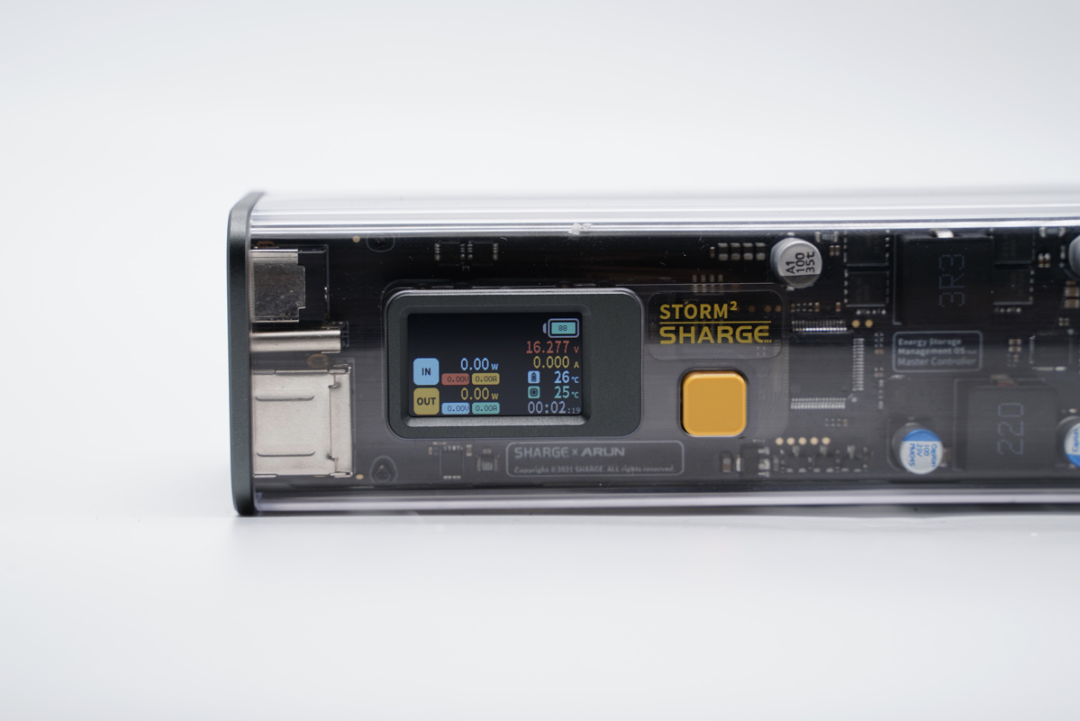SHARGE闪极DT终端控制器反面选用一块显示屏,透过单击右侧的按键能点亮自带的数显屏,从数显屏上能窥见当前输入/输出的电压、电流、功率和工作时间,外部的电池组温度等一系列数据。