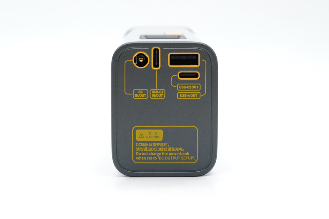 SHARGE闪极DT终端控制器的USB全部集中在前部,分别为DC输入/输出USB、USB-C1输入/输出USB、USB-C2输出USB和USB-A输出USB并注明:DC输出状态开启时,请勿透过DC口给此设备电池组