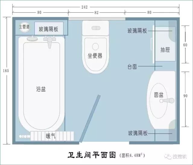 4.大便器的下水口距墙按300坑距,考虑留洞和安装管道5.卫生间地面应有2%坡度向地漏,装修房应有0.2%坡度坡向地漏6.避免暗厕,暗厕局外通风道,其边线应避免靠近公用管及坐落于门后7.若卫生间结构设计安装普通浴缸,则窗台度无法小于500:若卫生间结构设计安装按摩浴缸,则窗台度不恩能够小于600;若要安装三角按摩浴缸,则窗台度无法小于700。