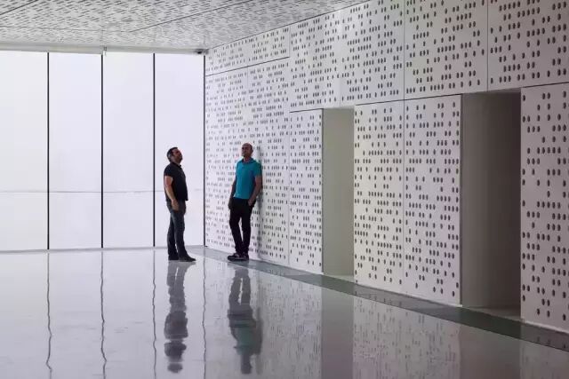 当这把‘火’熄灭时,建筑物物光华尽退,如同燃烧过的灰烬”对于门廊的照明来说,让人们仅仅能看到光线而看不到光源,这是很关键的结构雕塑家将光线投射到内部门廊上,从而实现了这一目标,他们让光线柔和地穿透建筑物的多孔表皮。