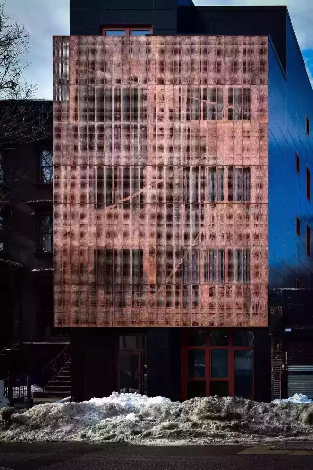 Aperture 538Luca Andrisani Architect结构设计布什山的余户家庭写字楼,在皇后区哥伦比亚特区大街附近内部的核心理念是铜萤幕,皇后区桥抽象化影像的冲孔板,对通风和水蒸气环流问题展开了改进,就完成了克勒姆的外形。