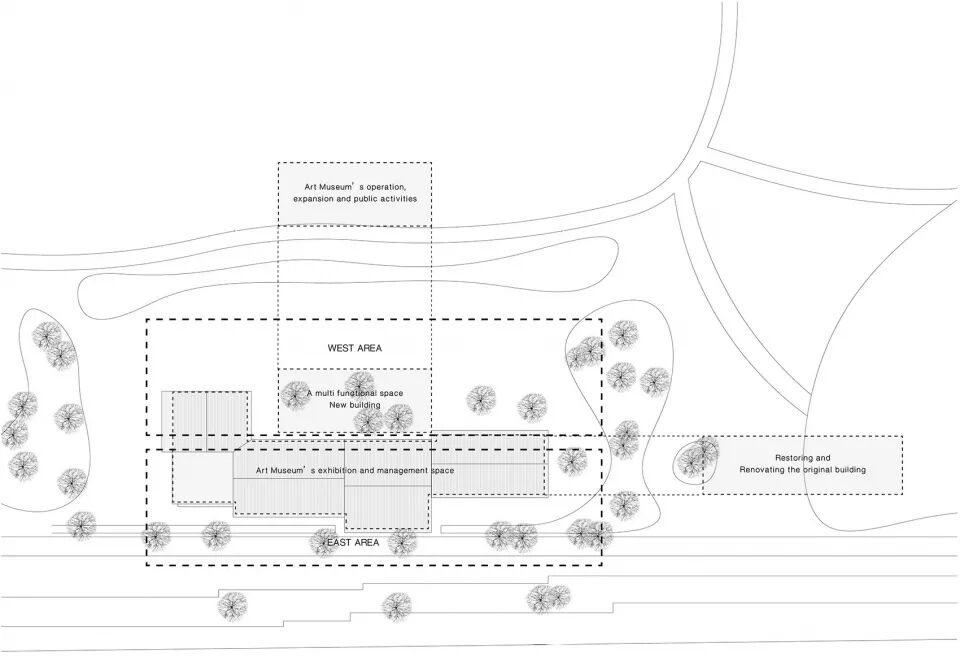 对于场馆北侧公用空间的处理,他们把原来内部的场馆打开,并和园林建筑出口处中心广场结合,消除艺术馆与北侧森林公园中心广场的物理边界建筑物北侧典雅的博风门廊在改建后将会成为出口处中心广场的一个重要公用景观背景,限定出中心广场与艺术馆的抽象边界,同时也会作为艺术馆的一个天然标志。