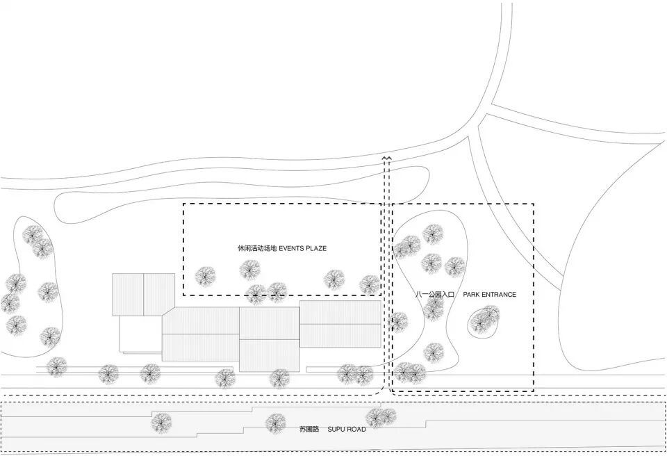 他们希望通过改建原建筑物西侧利用率较低的公用园林建筑,并新增一个一层体量的多用途建筑物,最终在西侧场馆形成一个有序过度的、可随时变换不同功能主题的公用后院,从而激发场所的活力在闲时可作为邻近住户的休憩场所;当有特别活动举行时,场馆可以通过新增建筑物的门廊开合,形成不同类型的活动、演出空间。
