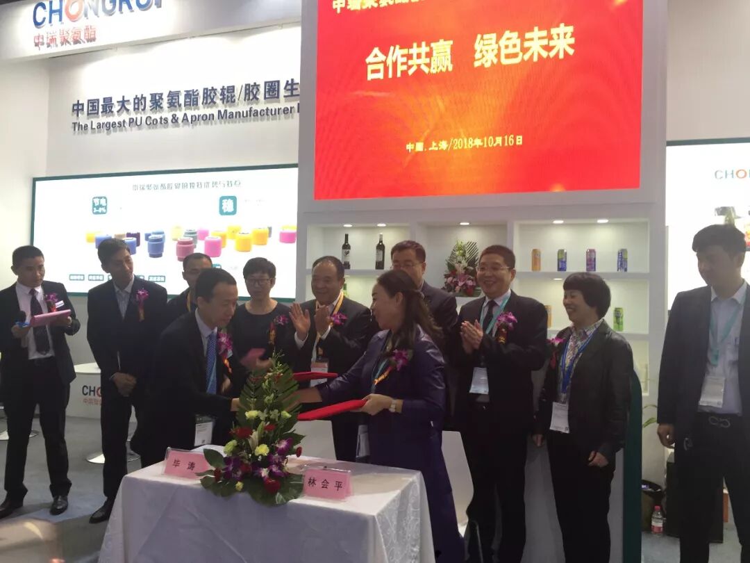 这些产品特性获得了众多企业的认可10月16日上午,2018中瑞聚氨酯&青岛金汇丰战略合作签约仪式在H2C17展位举行中国纺织机械协会副会长顾平、金轮针布(江苏)有限公司董事长龚伟、中国纱线网董事长王果刚、三门中瑞聚氨酯科技有限公司董事长林会平等嘉宾出席了活动。
