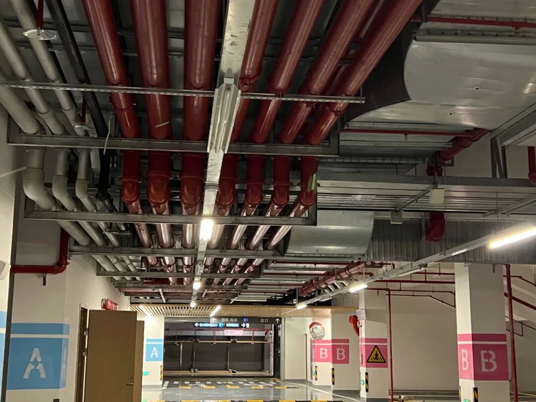 其中,智能物流系统和垃圾被服系统的引入,让施工难度再次升级这两个系统的管线直径达到600毫米,且需预留一定的坡度空间,这给本来就捉襟见肘的有限空间的管线排布提出了更高的要求而地下车库南走道区域,在间距净宽1.7米、层高5.2米、梁底4.7米的空间内需排布将近20多根大大小小的管线,复杂程度可想而知。
