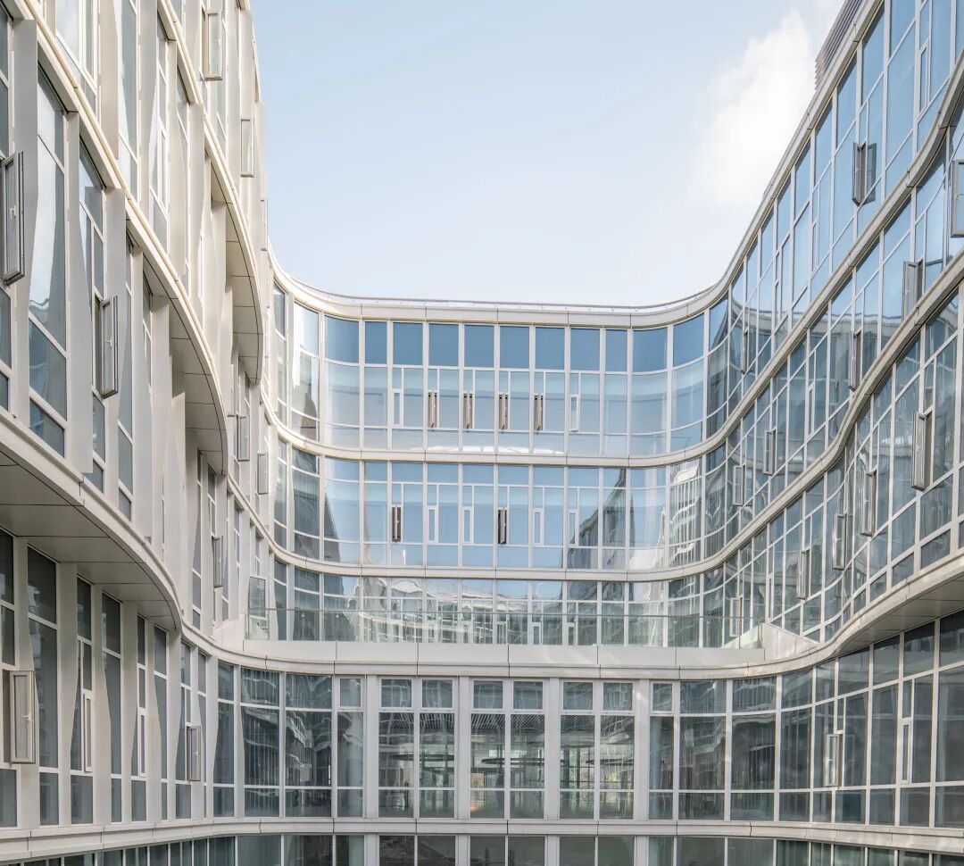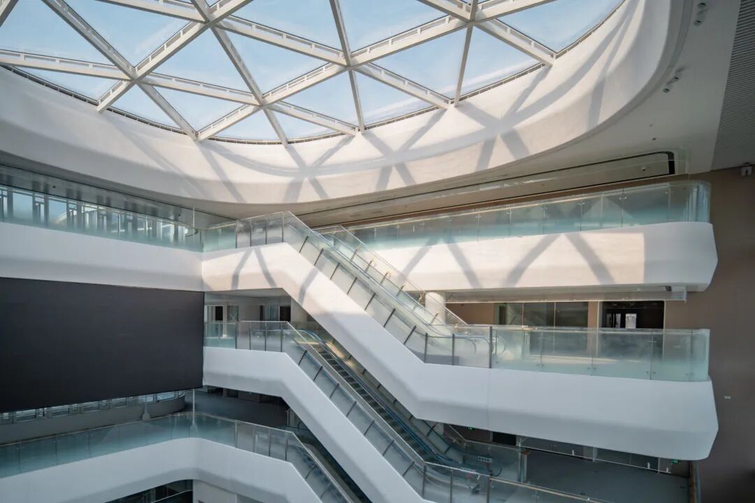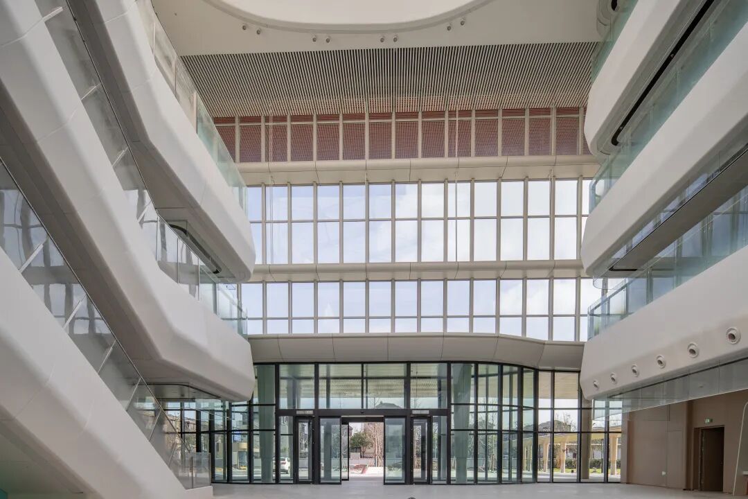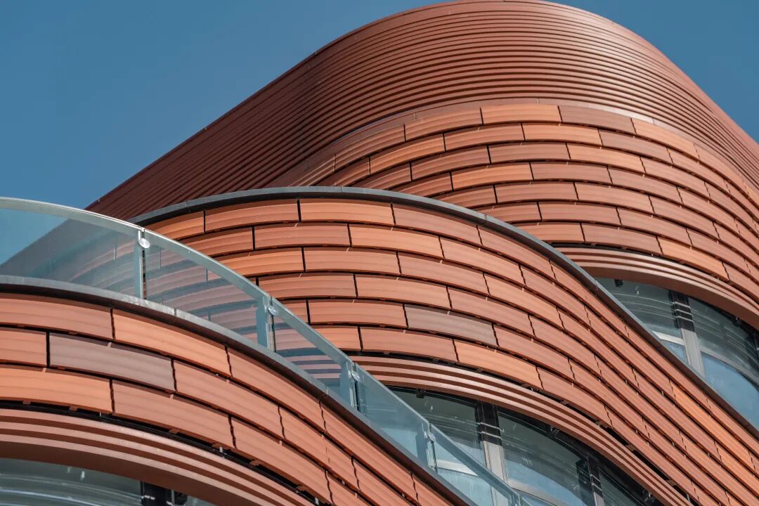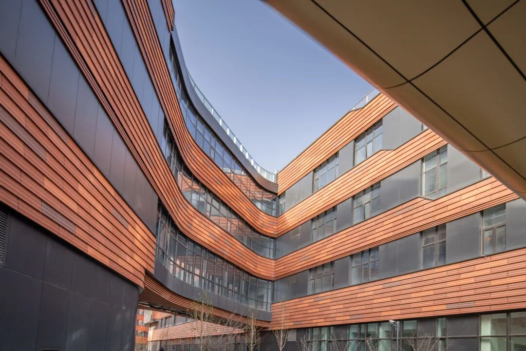 全面结构封顶匠心为本,让“篦齿”名副其实建筑表皮由弧形的黄色铜条与陶管包裹,层叠斜错的排列方式与水波纹的表面处理呈现了新院区的独属特征,既有“篦齿”的传统神韵,又别具现代前沿特色为满足妩媚抛物线形态的设计要求,整个幕墙结构共运用了陶土板幕墙、玻璃幕墙、铝合金盖板等在内的12种幕墙结构,总面积达3.6万平方米。