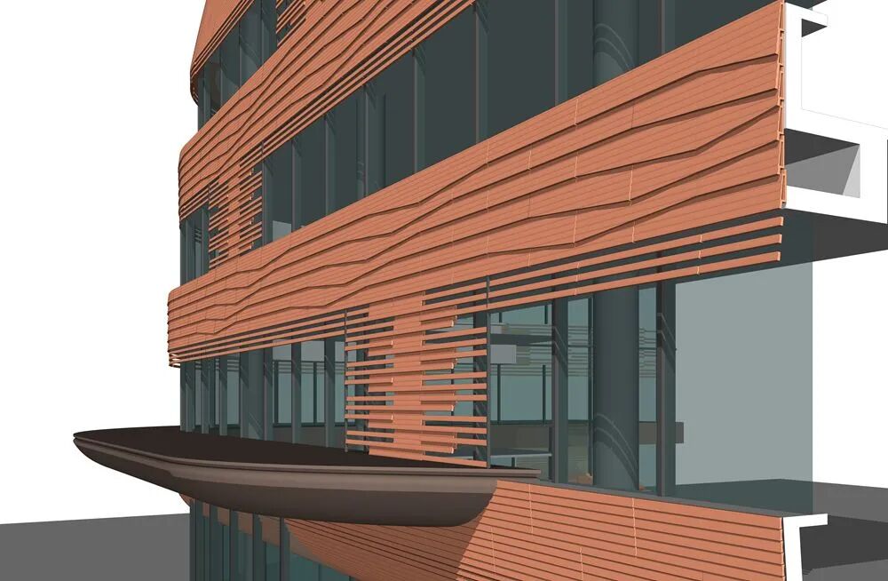 根据铜条材料和骨架体系,项目团队选用了曲面上设计骨架系统比较复杂的竖向龙骨与主体结构连接、横向龙骨与竖向龙骨焊接体系,并进行工厂定制;同时,利用BIM建模精准控制大量幕墙预埋件的位置,确定曲面段和平直段的安装区域,以+0.000为基准点,复核结构标高和每个标准层的标准点。